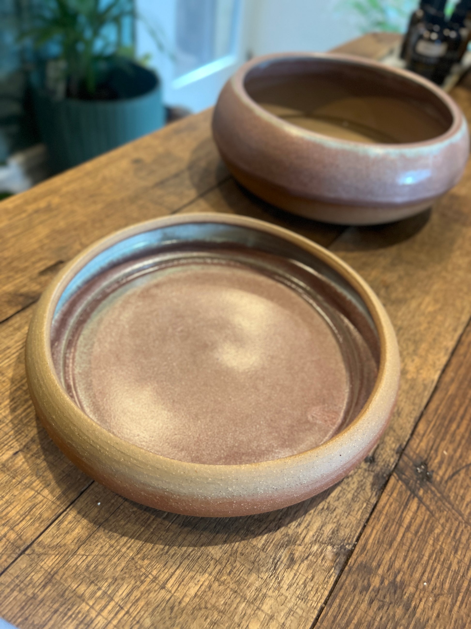 Handmade planter with drainage holes and glazed saucer.